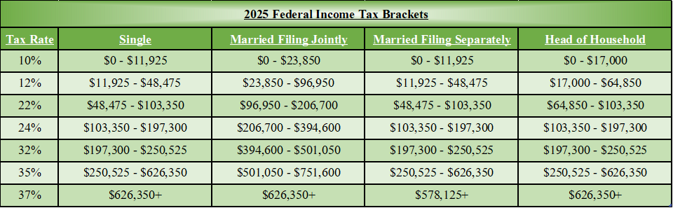 One principal result of the tax portion of the bill was to make permanent (for now) many of the tax provisions of the 2017 Tax Cut and Jobs Act (TCJA) that were scheduled to sunset at the end of this year. Among the provisions that will remain are the current tax brackets, with a top bracket of 37% (see chart that follows this message); the enlarged standard deduction and limitations on itemized deductions that have simplified tax reporting for many; the limit on mortgage interest deduction to the first $750,000 of home acquisition debt; the section 199A 20% deduction for qualified business income (QBI); and the child tax credit, which rises to $2,200 per child for 2025. The estate and gift tax exemption, which is currently $13.99 million per person but was scheduled to be cut in half in 2026 has instead been made permanent at $15 million per person ($30 million per married couple), indexed to inflation, beginning in 2026.